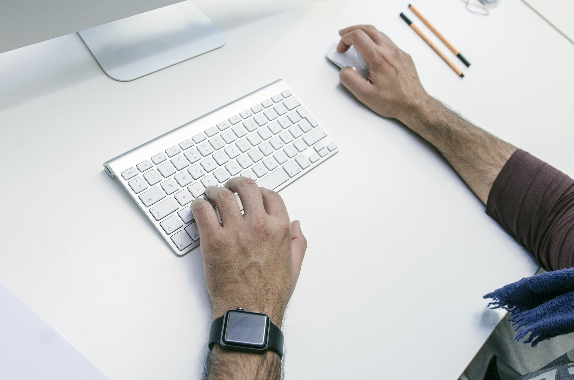 Ein Taschenrechner, eine Brille, ein Block, ein Apfel und viele weitere Büroartikel liegen auf einem Tisch.