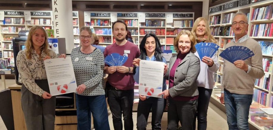 Caption: Standing up together against violence and exploitation of women and girls: Miriam Drüppel (Deputy Women's Representative), Claudia Engelmann and Jeremy David Kugler (Thalia Korbach), Nüket Duru (Buchland Bad Wildungen), Martina Weinreich (CoLibri Korbach), Beate Friedrich (Women's Representative), Bernhard Schäfer (Buchland Bad Wildungen) (from left to right). (Photo: District of Waldeck-Frankenberg)