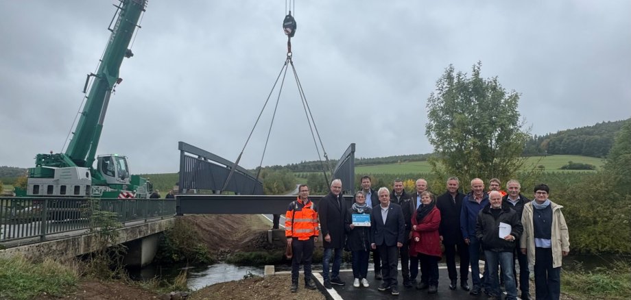 Caption: Between the state border with North Rhine-Westphalia and the Billinghausen estate in Diemelstadt, there was something exciting to watch: On behalf of the district, large prefabricated parts for the footpath and cycle path bridges were placed on the abutments of the bridges over the Diemel and the Mühlgraben. Representatives from the district, the town and the companies involved were also present. (Photo: District of Waldeck-Frankenberg)
