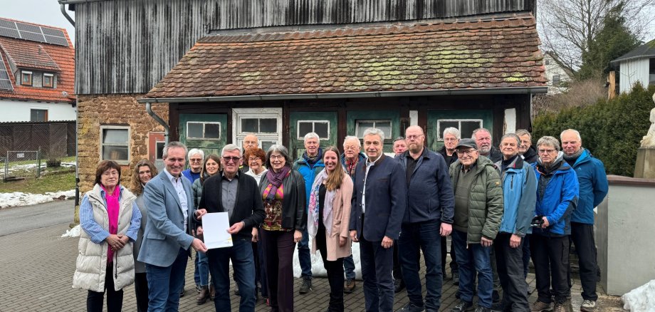 Caption: The conversion of the school barn in Schreufa into a training and exhibition building is being subsidised with around 200,000 euros in LEADER funding. District Administrator Jürgen van der Horst recently handed over the decision to Chairman Werner Böhle. Also present were Frankenberg's mayor Barbara Eckes, the chairman of the LEADER region Burgwald Ederbergland Rüdiger Heß, many members of the association and representatives of the district. (Photo: District of Waldeck-Frankenberg)