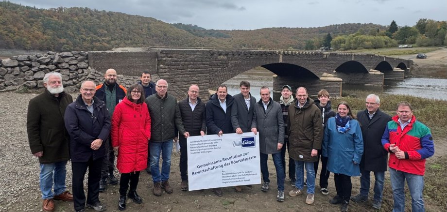 Başlık: Waldeck ve Bad Wildungen ilçe ve beldeleri ile Edertal ve Vöhl belediyeleri, Edersee Gölü'nün su yönetiminin daha da geliştirilmesi yönünde aynı kararları ortaklaşa kabul ederek Su Yolları ve Denizcilik Kurumu temsilcilerine teslim etti. Toplantıda siyaset, turizm, Hessen Eyaleti ve Kassel Bölge Konseyi'nden temsilciler de hazır bulundu. Etkinlik, normalde suyun metrelerce altında bulunan Eski Asel Köprüsü'nde gerçekleştirildi. (Fotoğraf: Waldeck-Frankenberg Bölgesi)