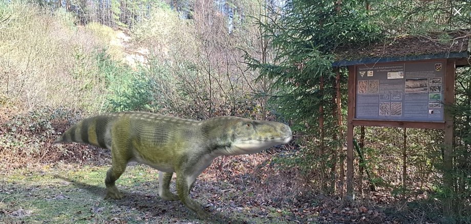 Підпис: Одна з цікавих новинок геопарку в ювілейному 2026 році: урхандтір Вольфгагера, який ожив завдяки доповненій реальності, на "своїй" геостанції в міському лісі. (Фото: Національний геопарк Гренц-Вельтен)