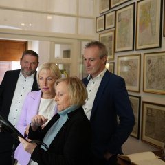 Підпис: Під час візиту до Фонду Бібліотеки Брема в замку Бад-Арользен міністр цифрових технологій Гессену проф. д-р Крістіна Сінемус (2 зліва) ознайомилася з проектом оцифрування "Відродження старих культурних скарбів до нового життя в цифровому форматі: Бібліотека Брема як інтерактивний музей", який фінансово підтримує земля Гессен. Його представили науковий співробітник Фонду Філіп Веккер (ліворуч) та виконавчий директор Керстін Браун (3-й справа) у присутності районного адміністратора Юрґена ван дер Хорста (праворуч) та мера Бад-Арользена Марко Ламбіона (2-й справа).