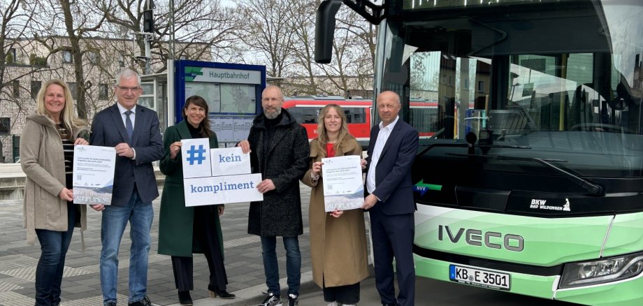 Підпис до фото: У загальнонаціональній кампанії #KeinKomliment у 2026 році також беруть участь район, EWF, NVV та Kurhessenbahn: (зліва направо) Таня Шрайбер, відділ з питань жінок та рівних можливостей; перший районний радник Карл-Фрідріх Фрезе; прес-секретар NVV Джудіт Фе де Лакруа; виконавчий директор EWF Франк Бенц; Міріам Дрюппель, заступниця керівника відділу з питань жінок та рівних можливостей; виконавчий директор Kurhessenbahn Йенс Враблец. (Фото: округ Вальдек-Франкенберг)